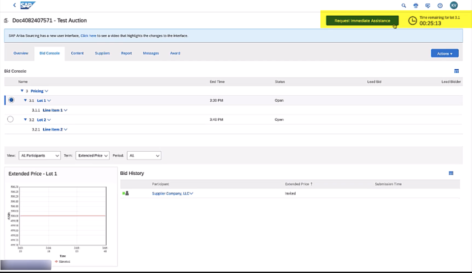 A: As of August 18, 2023, the feature Expedited Support Requests on Sourcing Auctions (SS-40648) adds a new Request Immediate Assistance button on the event page when it has less than 60 minutes remaining. This new button provides faster and more efficient phone support to buyers and suppliers during urgent bidding situations.