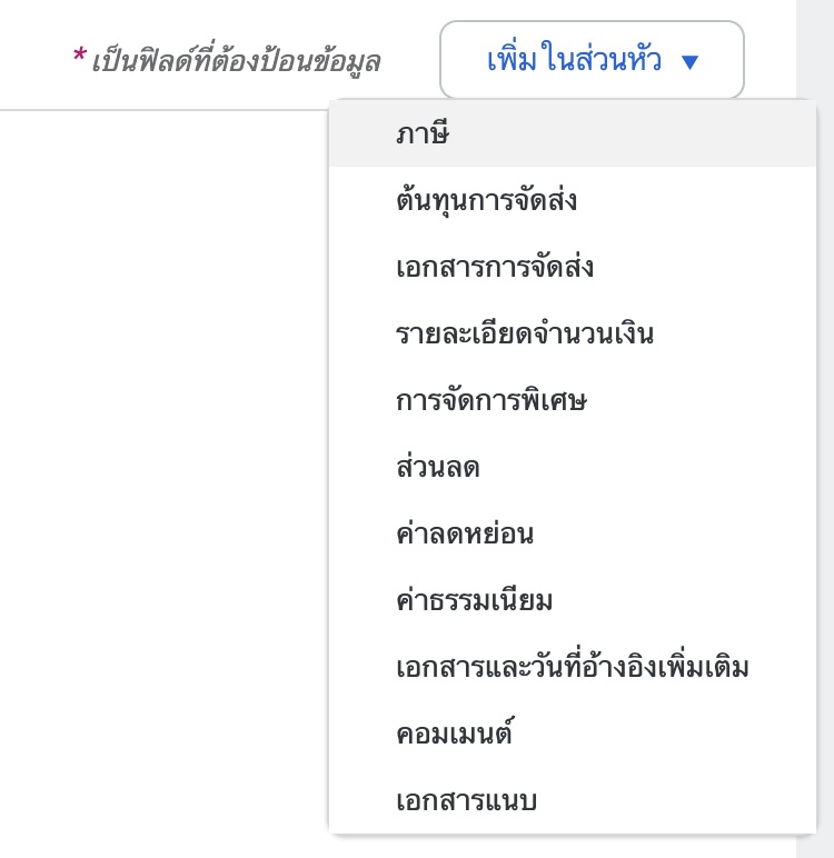หมายเหตุ : ลูกค้าของคุณอาจต้องการให้ป้อนข้อมูลบางฟิลด์ในระดับส่วนหัว ตรวจสอบฟิลด์ที่มีเครื่องหมายดอกจัน (*) และป้อนข้อมูลที่ต้องระบุ