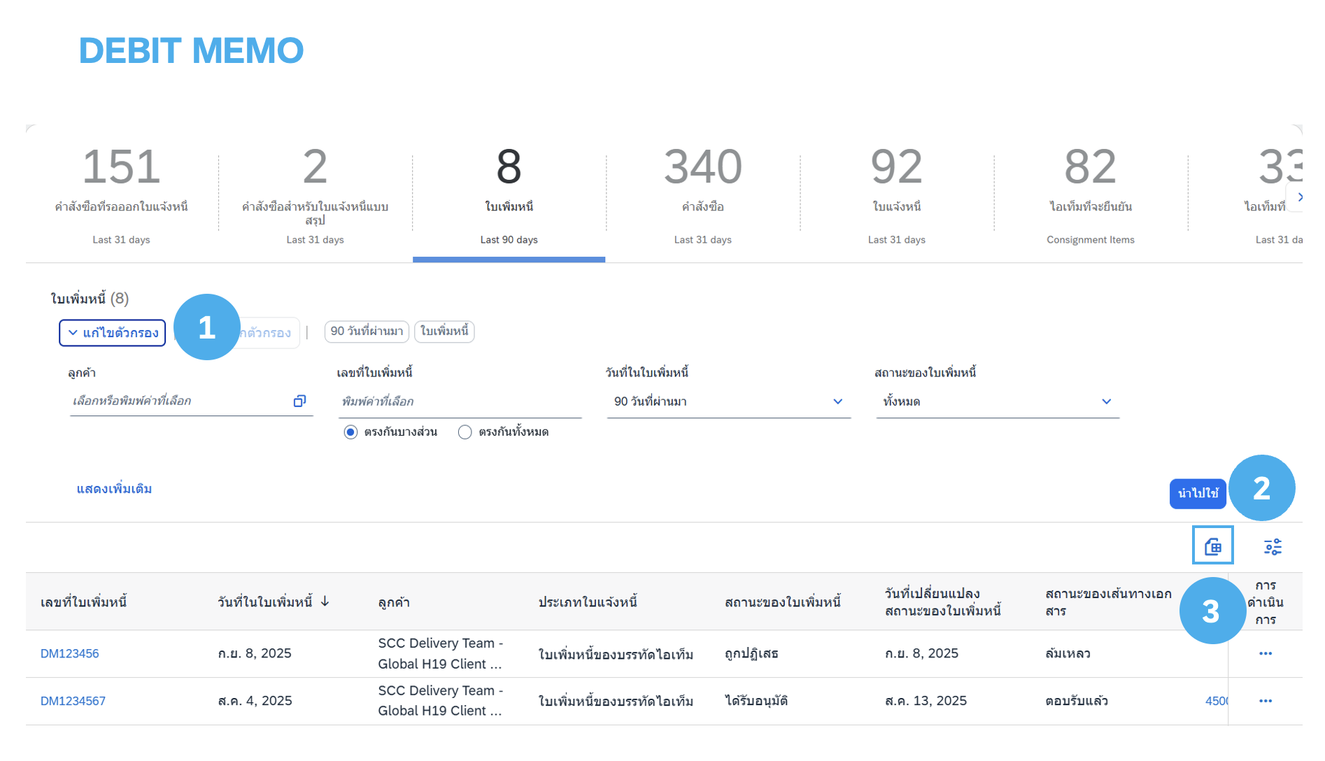 เมื่อคลิกที่ไทล์ รายการใบเพิ่มหนี้จะปรากฏในเวิร์กเบนช์