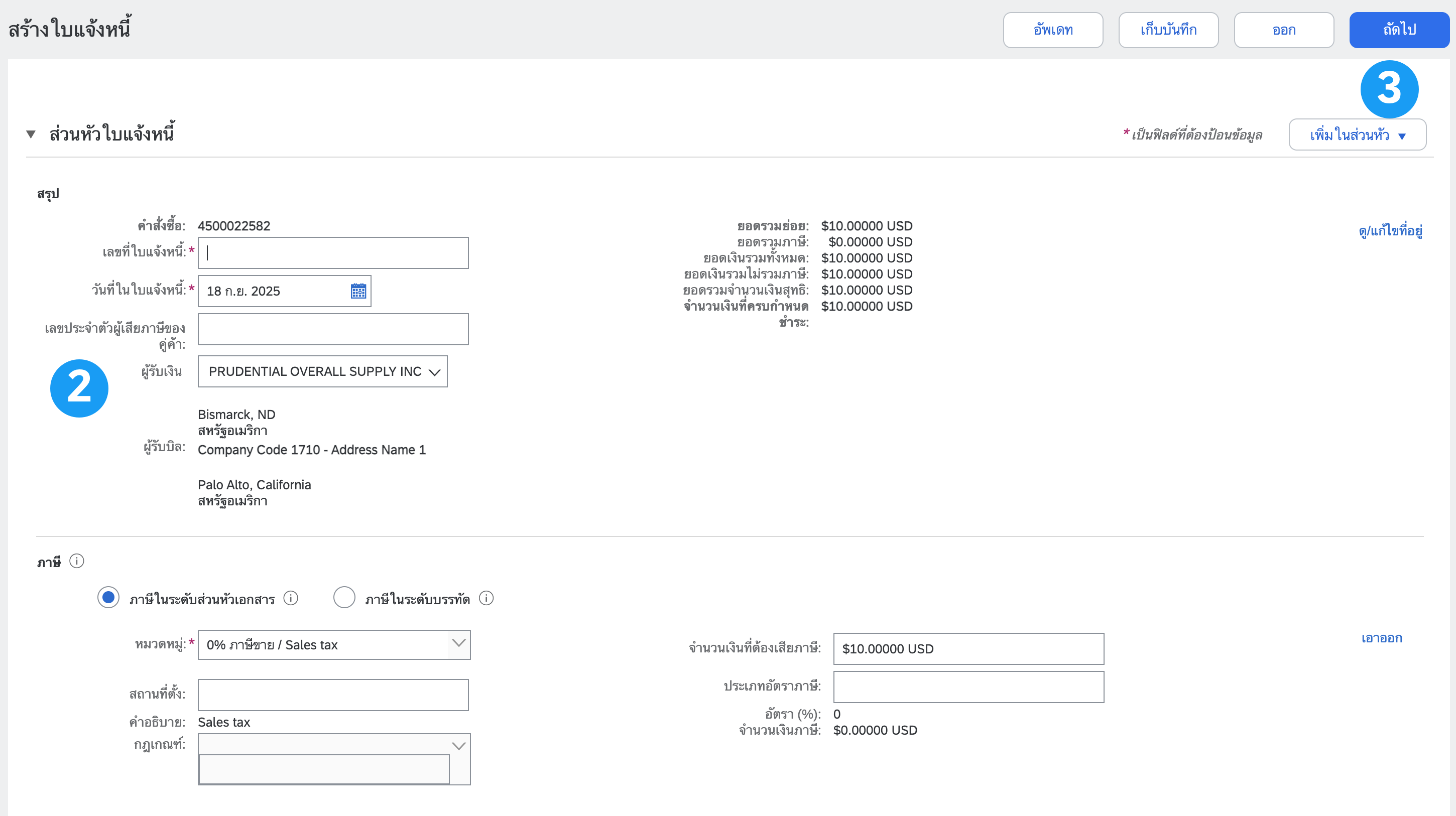 - คุณสามารถป้อนข้อมูลระดับส่วนหัวได้หลังจากรีเฟรชหน้าจอ กรอกข้อมูลในแต่ละเซกชันให้ครบถ้วนตามต้องการก่อนที่จะดำเนินการต่อไปยังเซกชันบรรทัด