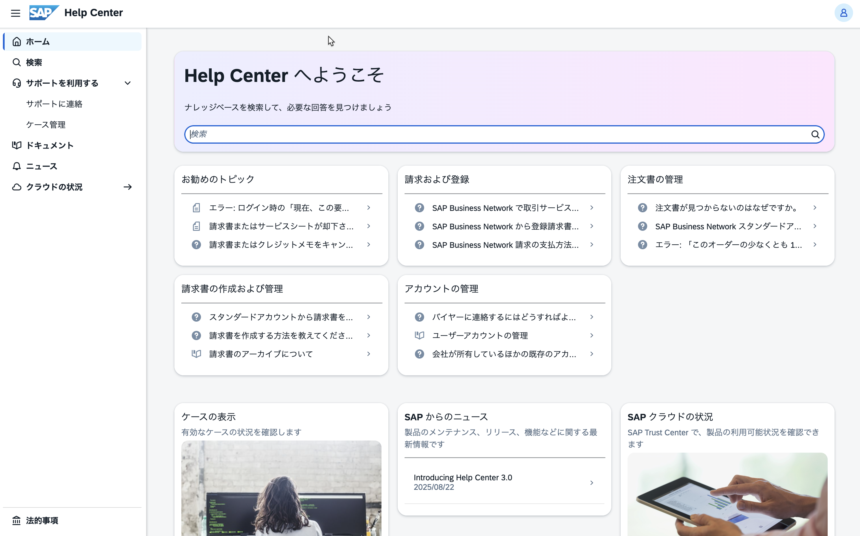 SAP Business Network ヘルプセンターからサポートにアクセスするには、https://supplier.ariba.com/ にアクセスし、ページの右側にある Help Center を利用します。