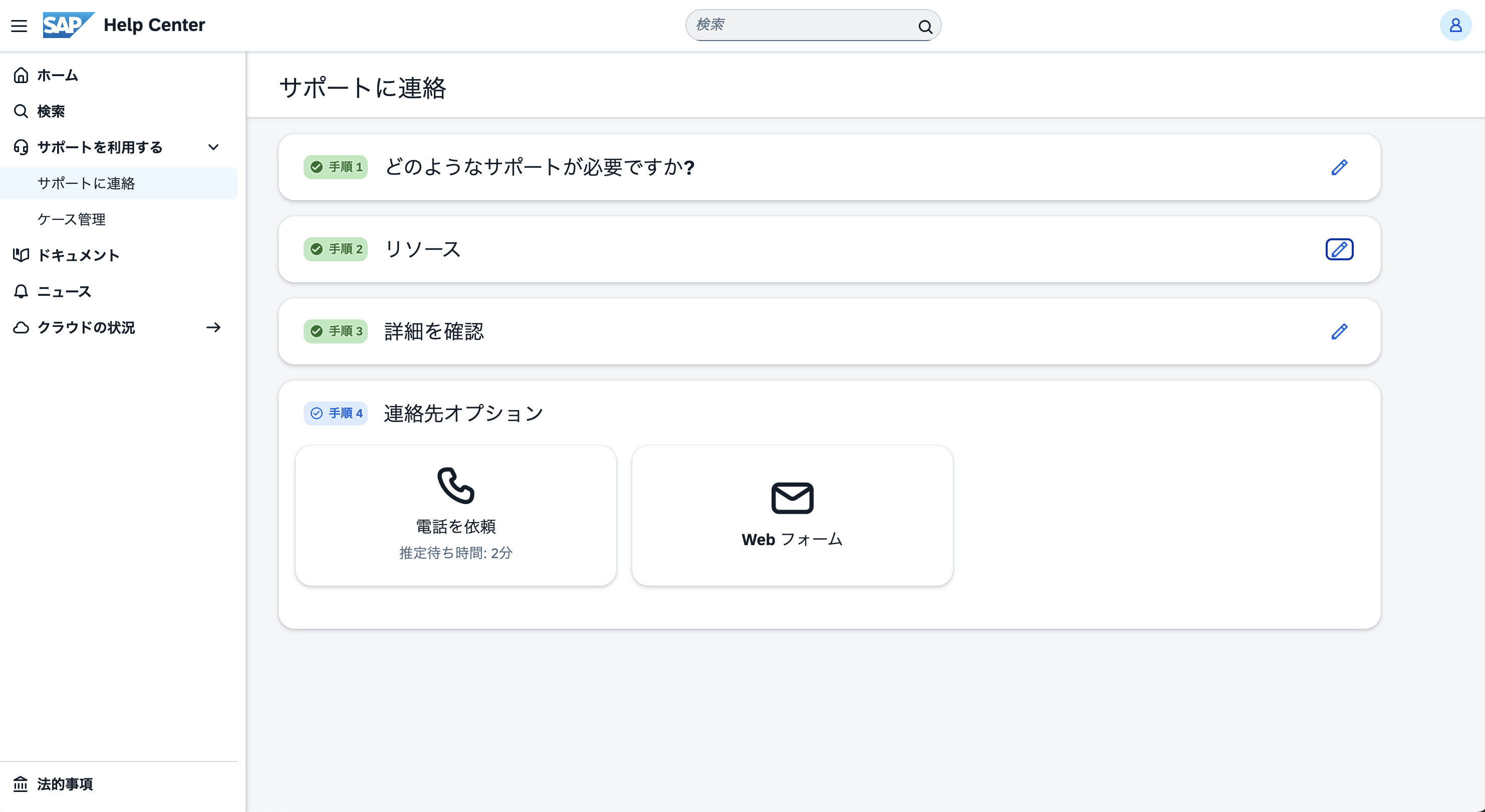 必要な情報が見つからない場合は、「連絡先」を選択してください。当社の強力な人工知能ベースのレコメンデーション・エンジンが、回答を見つけたり、サポートのための適切なチャンネルをご案内します。ご質問や問題についてのキーワードを入力すると、レコメンデーション・エンジンから結果が表示されます。該当する場合は、ガイド付きアシスタンス(Guided Assistance)をご利用ください。