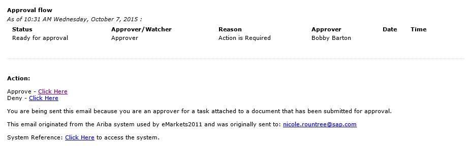 See example below. Original Approver was Bobby Barton, but the approval was sent to nicole.rountree@sap.com.