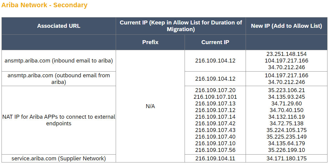 The related IP blocks will need to be added to your corporate allow-list, allowing for both inbound and outbound traffic, with immediate effect to prevent service disruption of users accessing SAP Ariba's Procurement Suite.