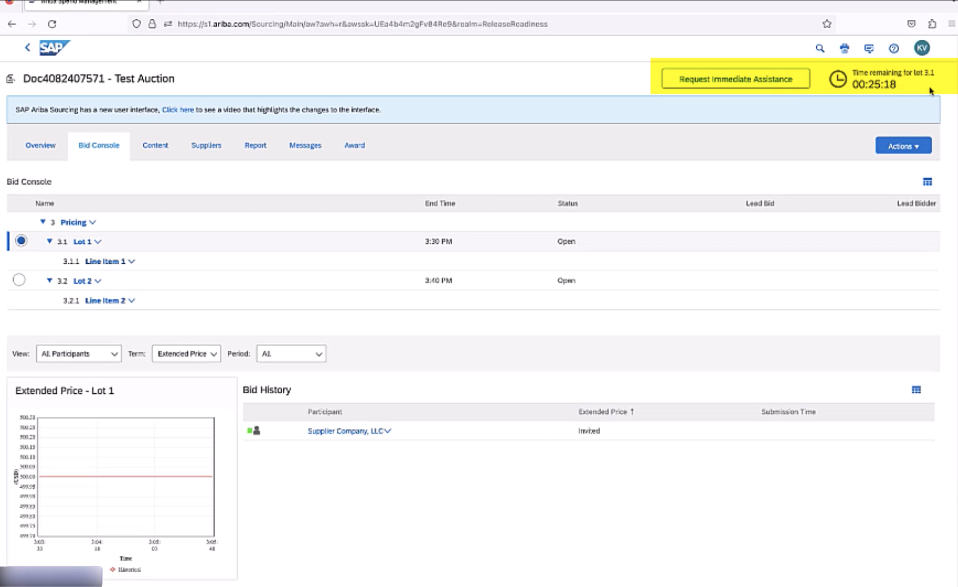 A: Ab dem 18. August 2023 fügt die Funktion Beschleunigte Supportanfragen bei Beschaffungsauktionen (SS-40648) die neue Schaltfläche Sofortige Unterstützung anfordern auf der Ereignisseite hinzu, wenn sie weniger als 60 Minuten verbleibt. Diese neue Schaltfläche bietet Einkäufern und Lieferanten in dringenden Bietsituationen schnellere und effizientere telefonische Unterstützung.
